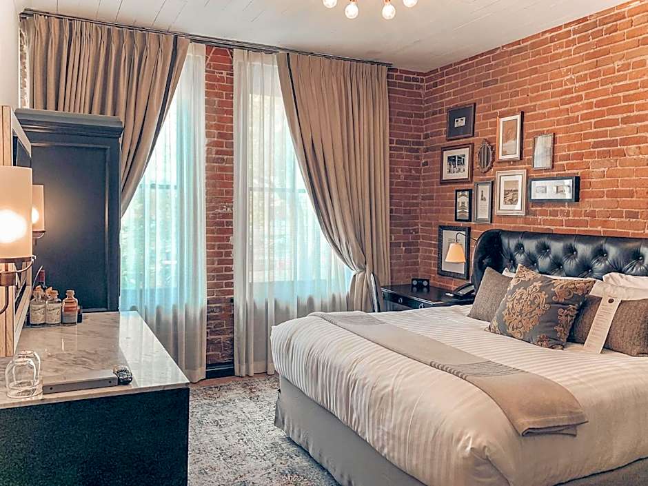 Lofted ceilings, exposed brick and wood beams fill this room. It includes a 48 inch flat-screen cable TV, mini-bar and refrigerator as well. Plush bedding and a rainfall shower highlight this luxurious room.